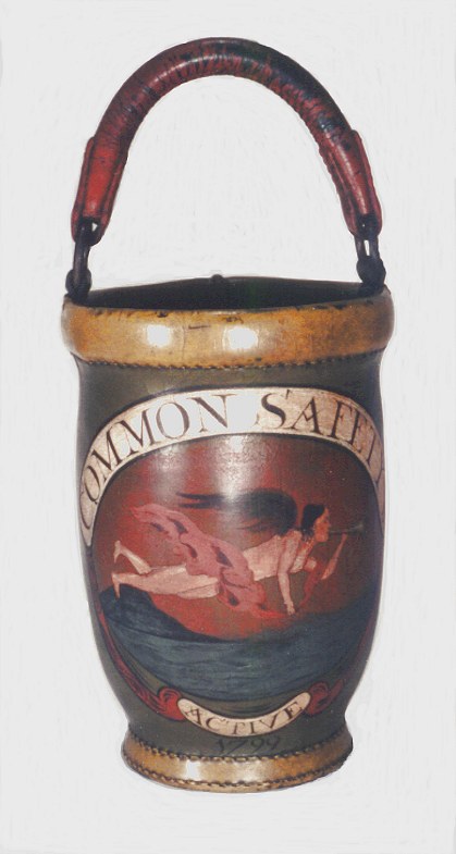 The original bucket that inspired this design was made in Boston around 1800. I'm not certain if this is supposed to represent the angel Gabriel sounding his horn of alarm, or if the artist was attempting to illustrate the mythical god Mercury, patron god of merchants, and had problems differentiating between the two. Mercury firebuckets were a common design during the period. Regardless of the artist's intent, it's an excellent design. |